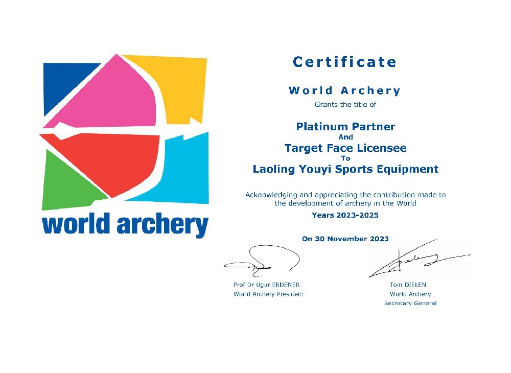 目前,主要生產(chǎn)和銷售射箭比賽及訓(xùn)練專用器材,包括:箭靶、靶紙、靶架、號碼牌、風(fēng)向旗、計時記分器等場地器材設(shè)備;反曲弓、復(fù)合弓、傳統(tǒng)弓、瞄準(zhǔn)器、防震桿等弓箭裝備;箭壺、護胸、護臂、護指等各類箱包護具。公司所生產(chǎn)的射箭器材已通過國際射箭聯(lián)合會及中國射箭協(xié)會CAA認(rèn)證。